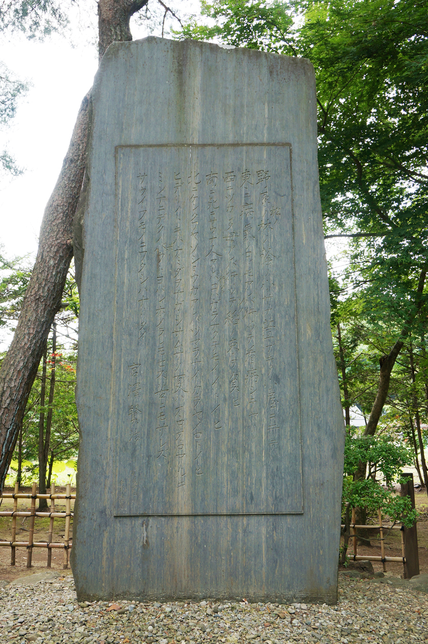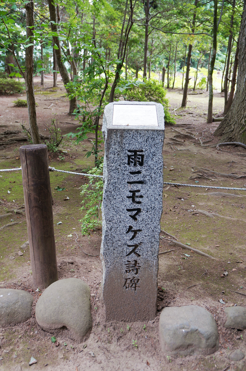 高さが3mを超える詩碑 碑文は宮沢賢治の死後見つかった手帳に記されてた「雨ニモマケズ」の後半部分で、高村光太郎の書によるものです