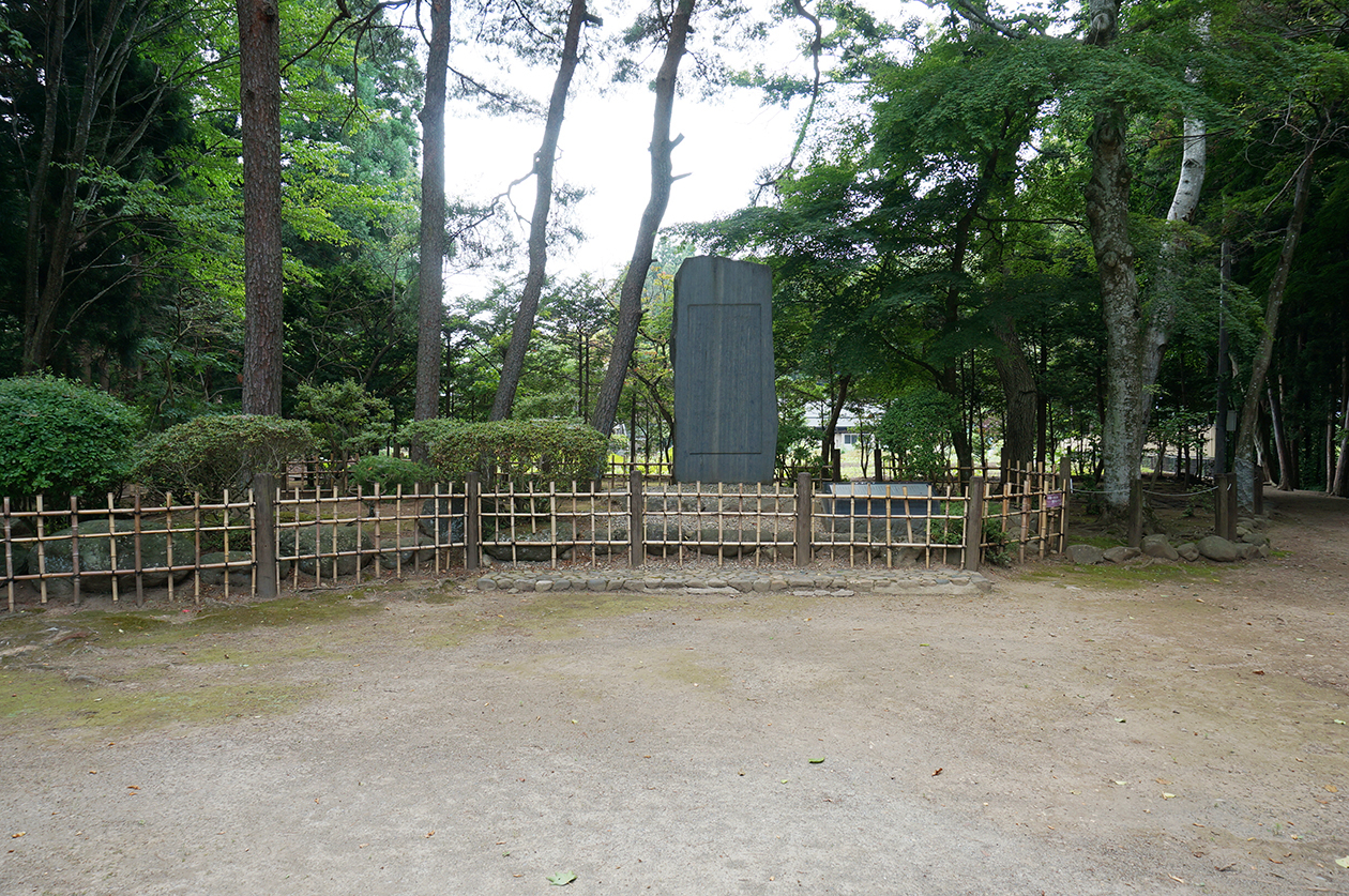 「賢治文学散歩道」脇に設置されている宮沢賢治を顕彰する石碑 告別という詩の一部が刻まれています、勤務していた農学校を自ら辞して「農業芸術の理想」実現に向けてこの地で活動する強い決意が読み取れます