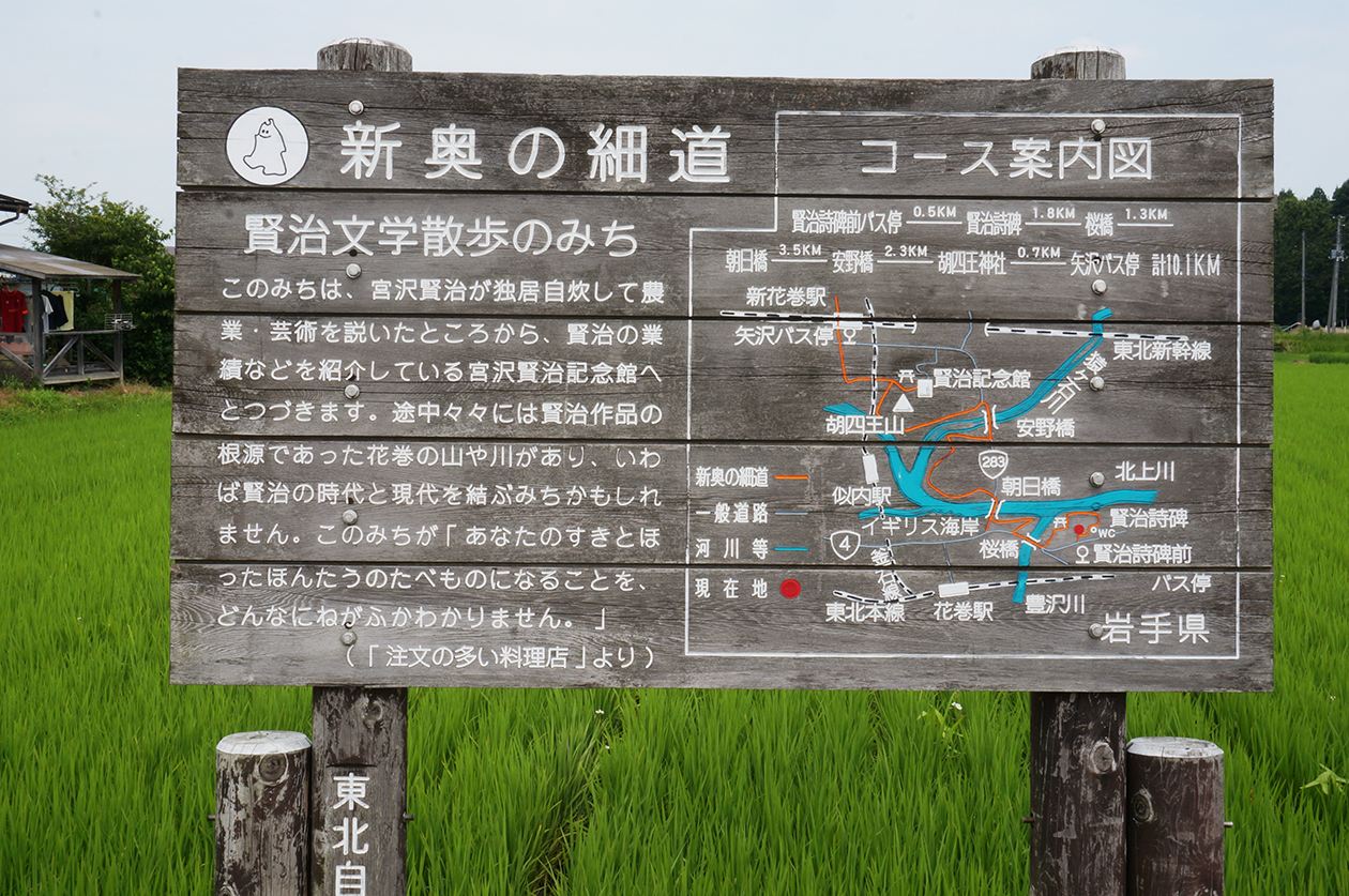 詩碑を訪れる人のための駐車場に立っている案内板 詩碑までの道のりは「賢治文学散歩道」の一部となっています