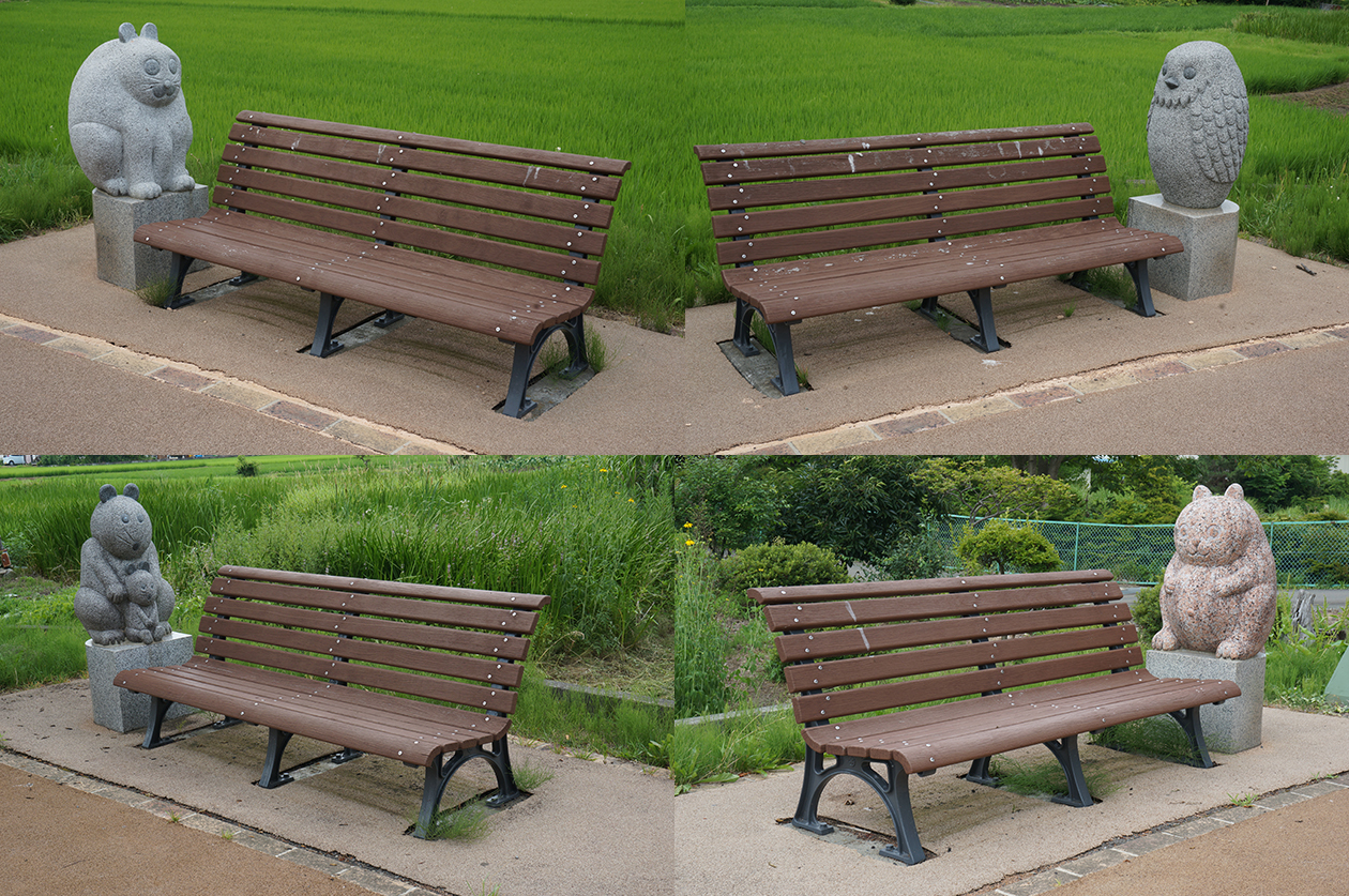 「賢治文学散歩道」脇に設置されているベンチと石像