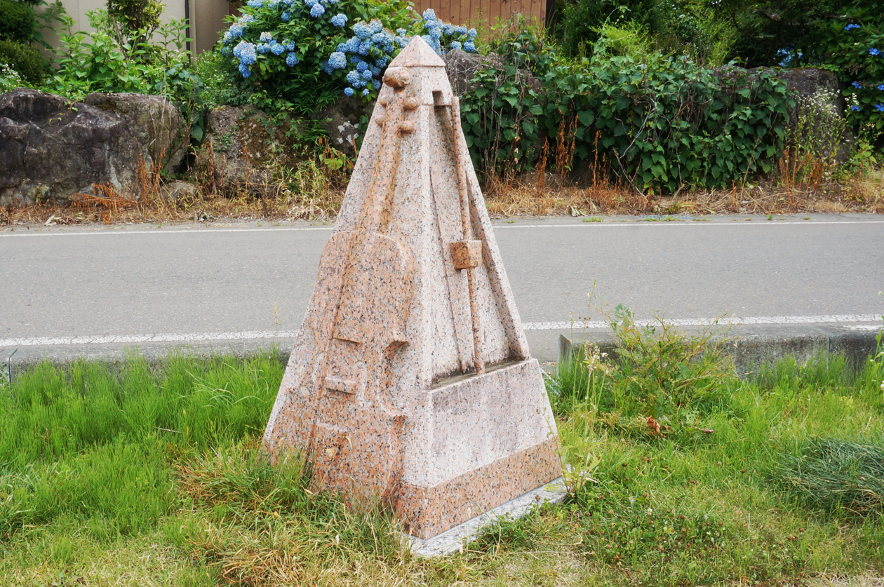 「賢治文学散歩道」脇に設置されているセロ弾きのゴーシュをテーマにした石の彫刻
