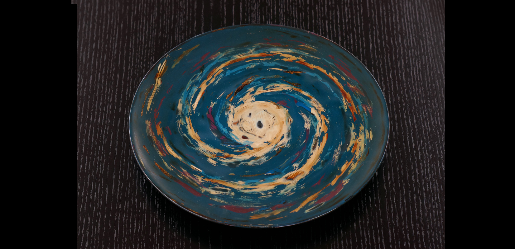 新作「漆で描く豆皿の世界 ~宇宙とつながる親子の絆~」では、身近に存在する太陽と月、生命の営みの象徴としての親子を描くことで、宇宙とつながる命の神秘と尊さ、そして命の源である宇宙の素晴らしさに対する思いを作品に添えています。