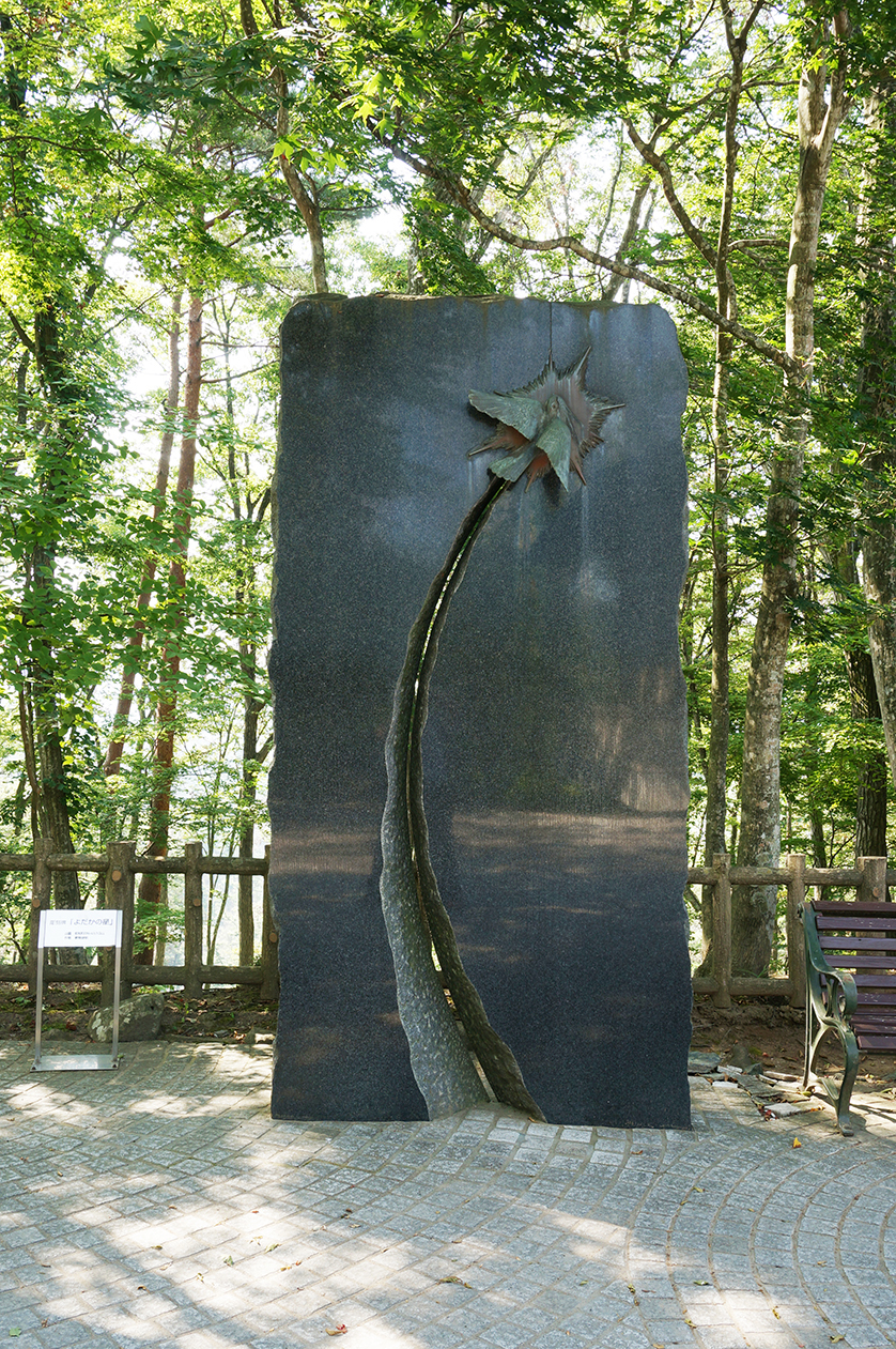 宮沢賢治記念館入口手前に鎮座する「よだかの星」彫刻石碑、高さ3m近くある大作です