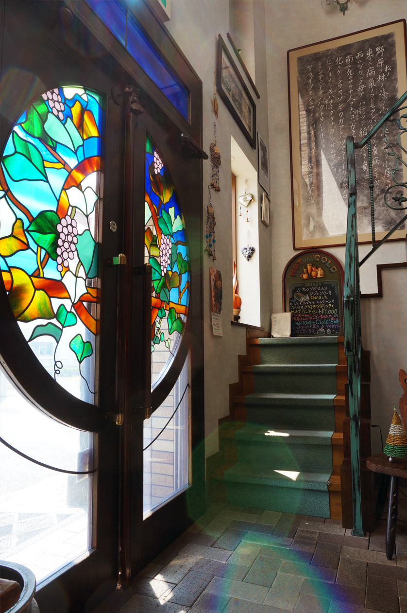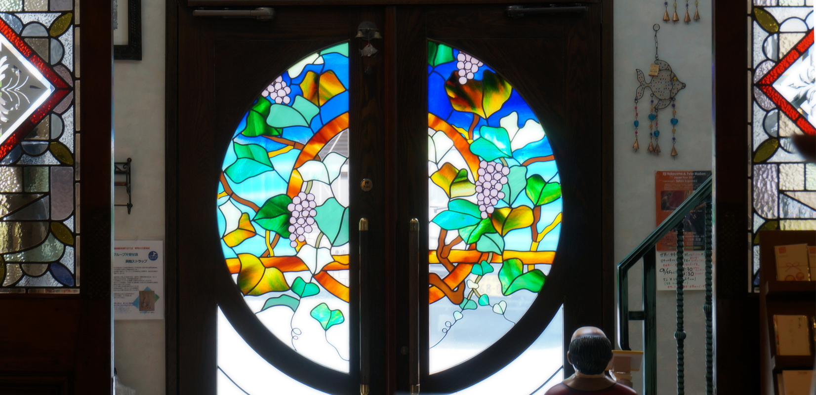 入口のステンドクラスの扉から差し込む光がとでも美しい!