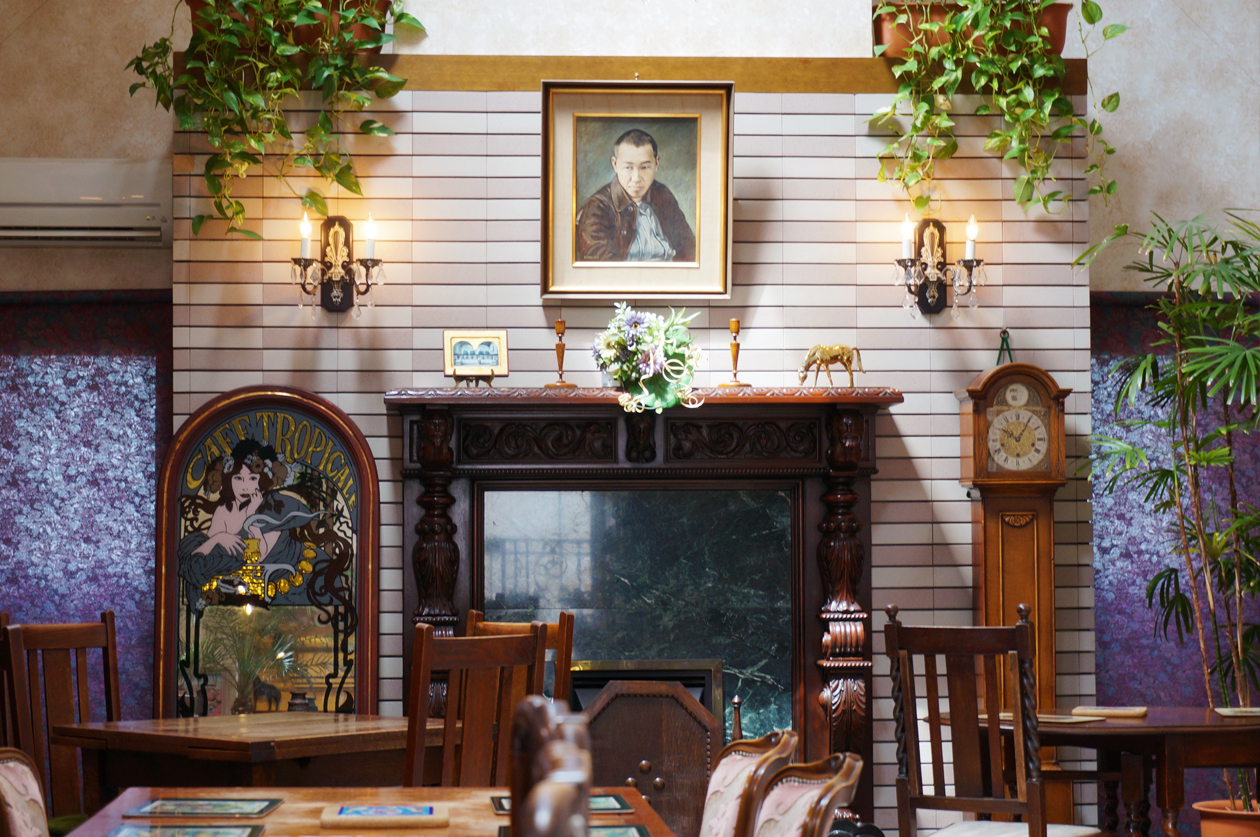 2階喫茶室 オーナーがイギリスから運んできた暖炉と置時計(グランド・マザー・クロックと呼ばれているとのことです)