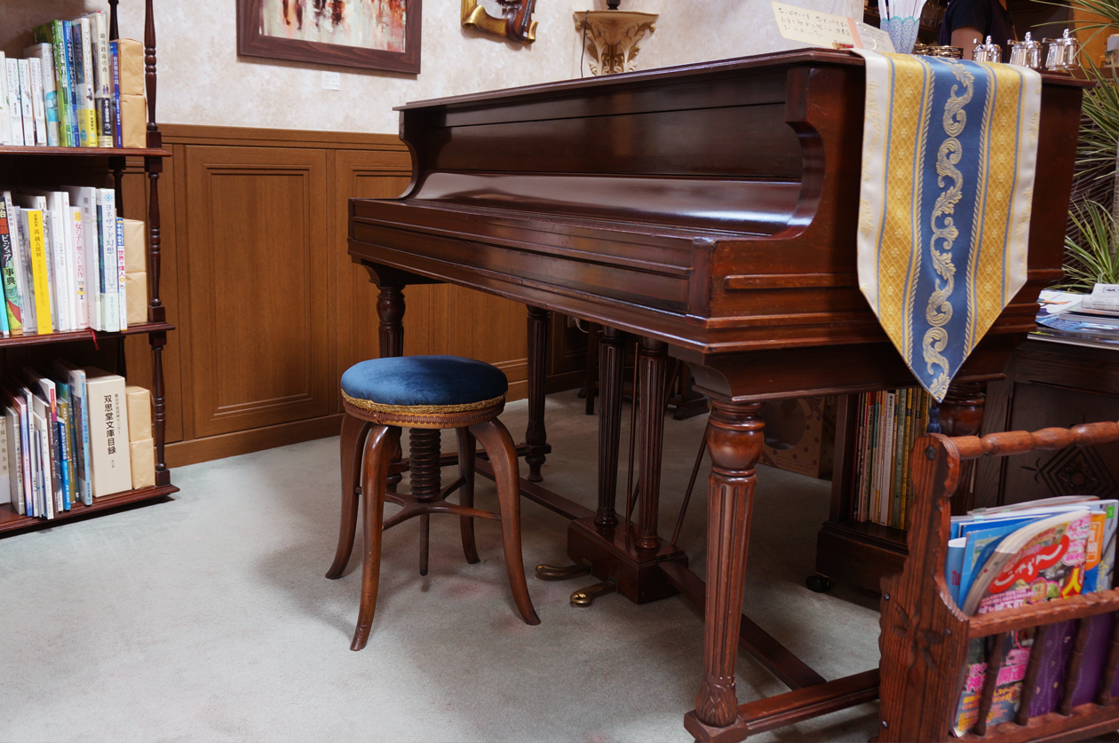 2階喫茶室 オーナーがイギリスから運んできたピアノ、アンティークですが定期的にミニコンサートで使用されている現役バリバリの幸せなピアノ